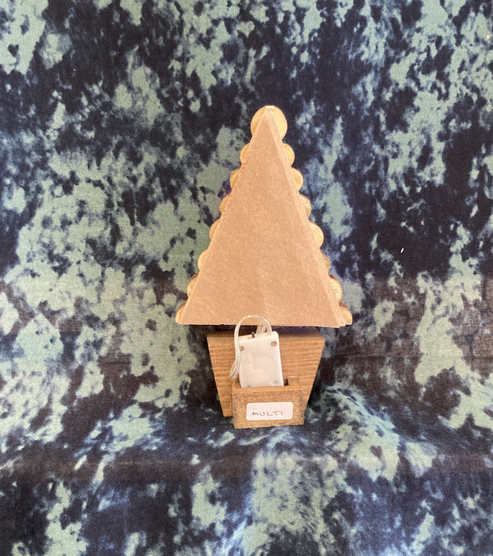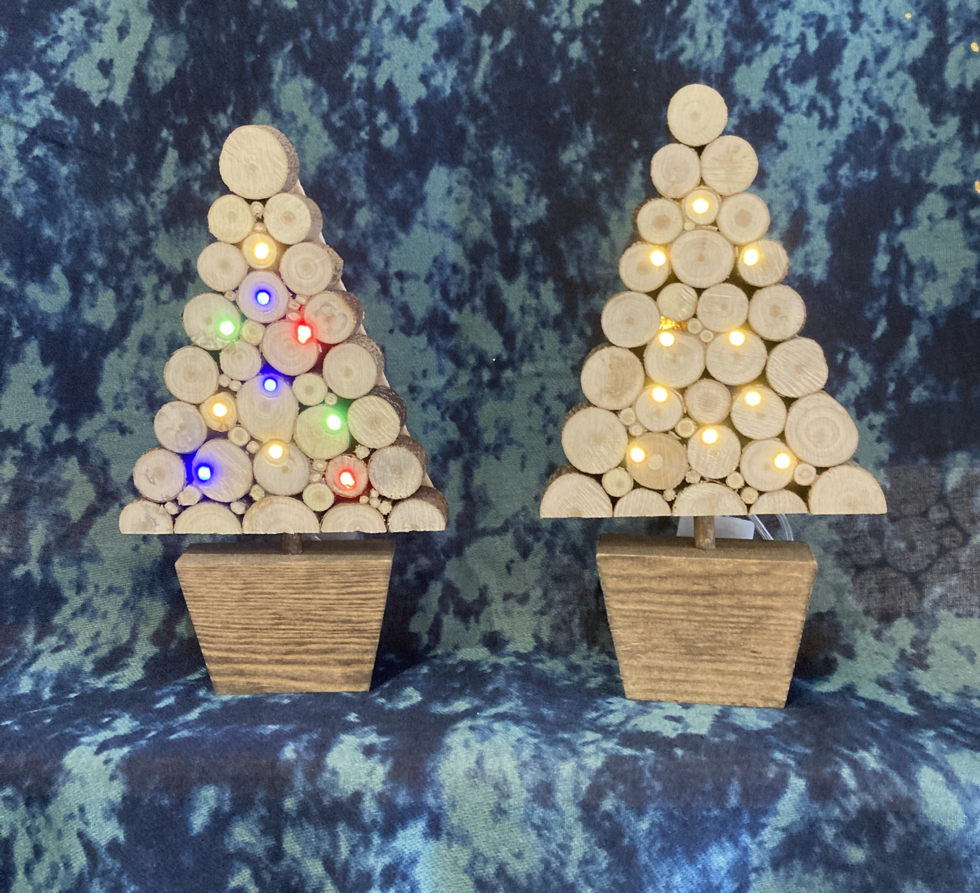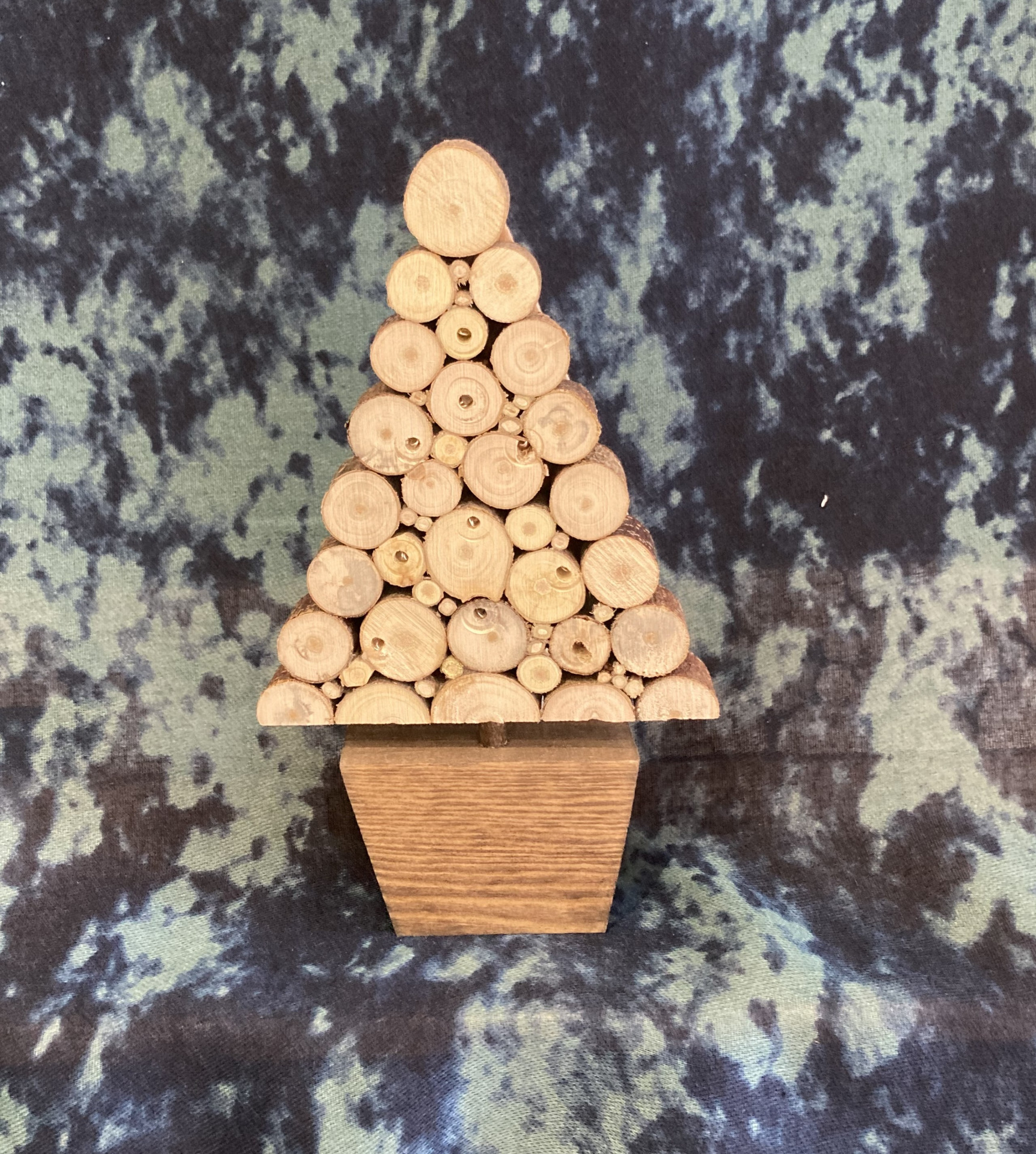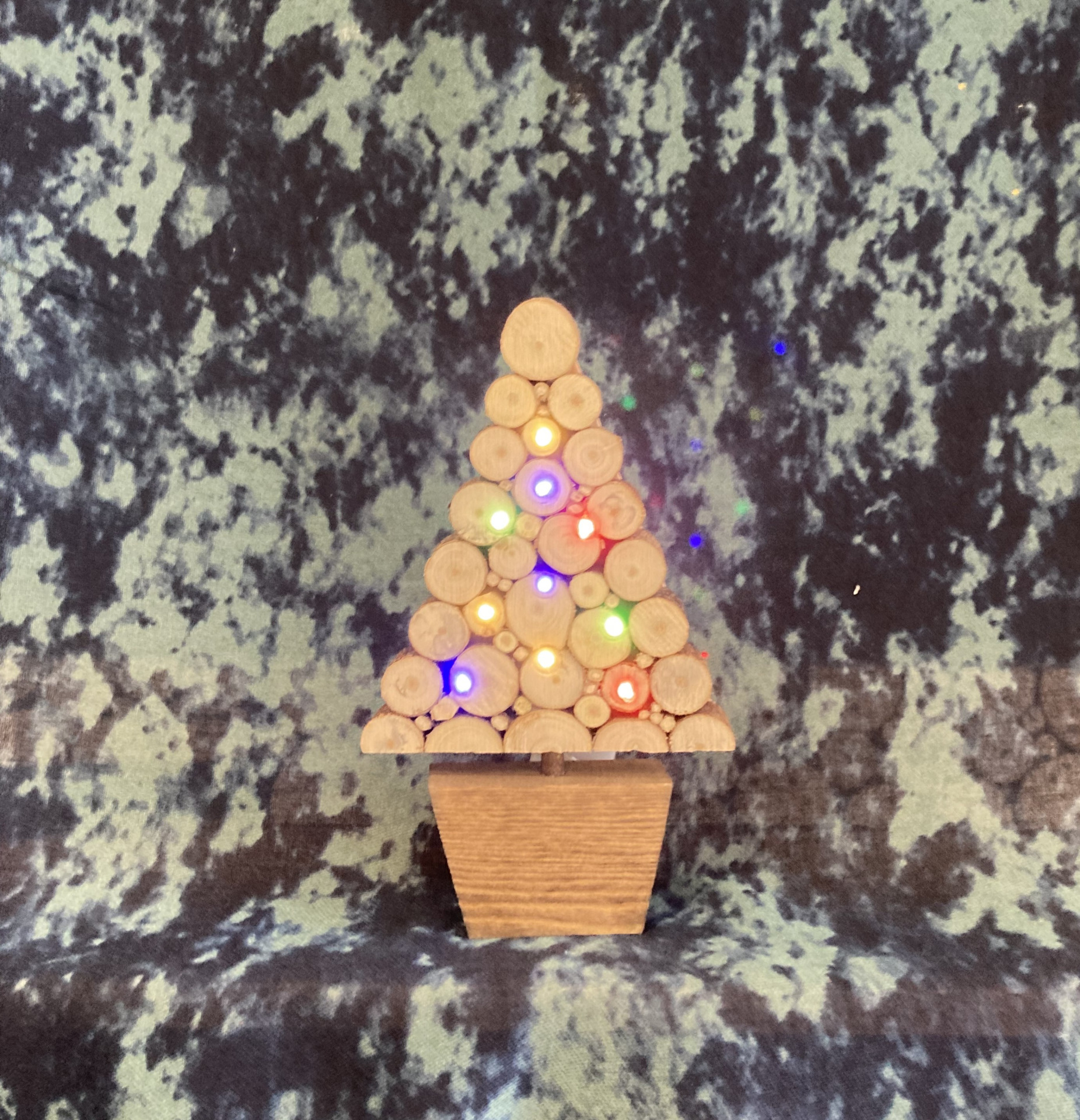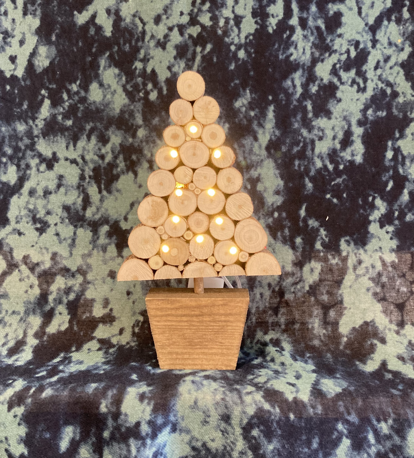 Handmade illuminated Christmas Tree made from slices of salvaged timber.